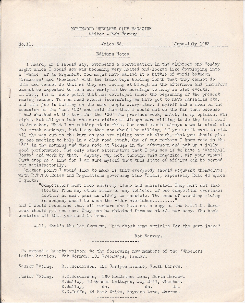 Bob’s editorial focusses on the tension between the trackies and the roadies, in the perennial problem over persuading club members to turn out and support events by marshalling etc. Here the guys who are focussing on track events are apparently not so willing to ride out to stand at the turn etc. Views of the members are invited.